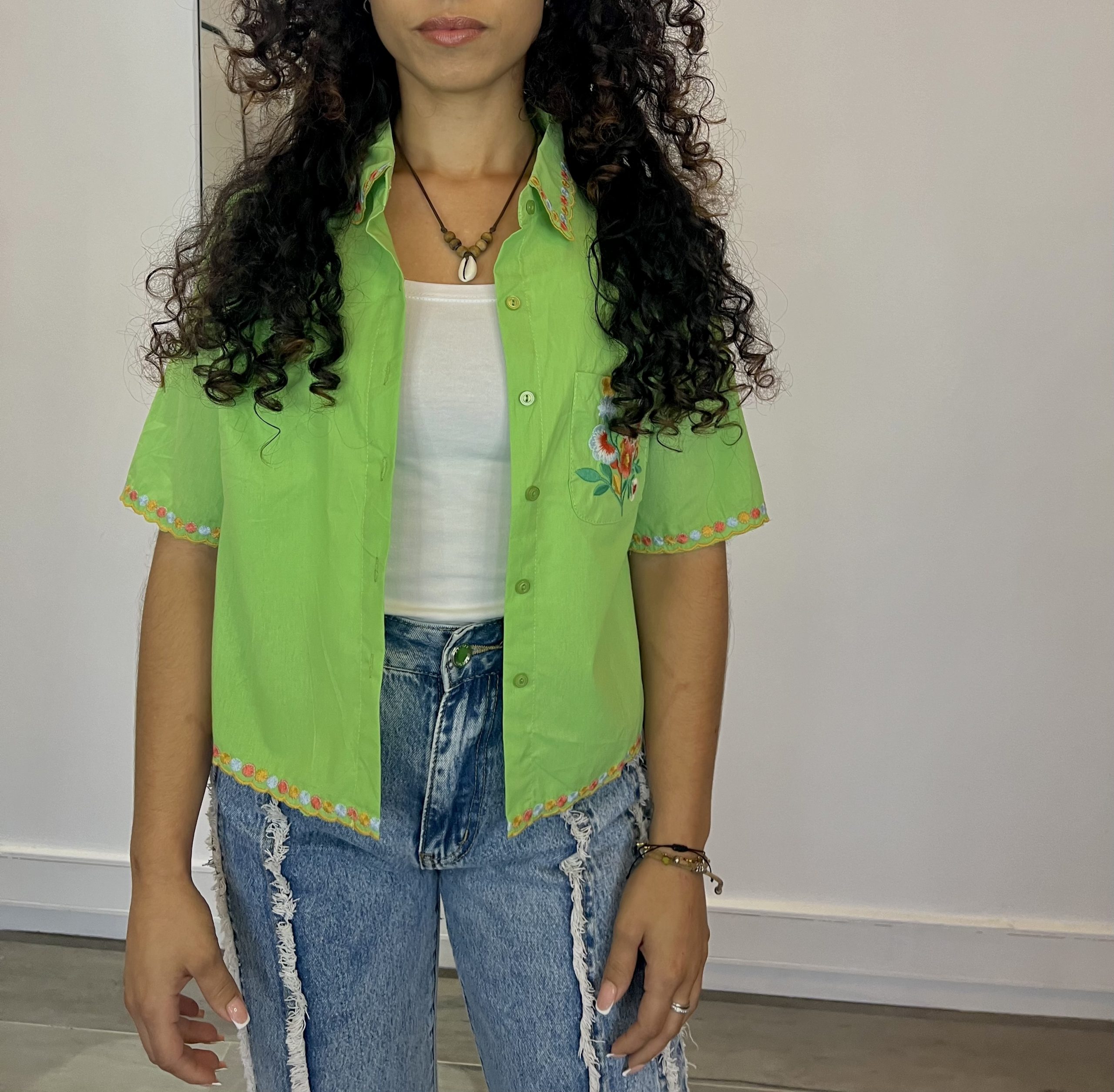Sa broderie florale colorée et ses finitions festonnées lui donnent une allure féminine et solaire.