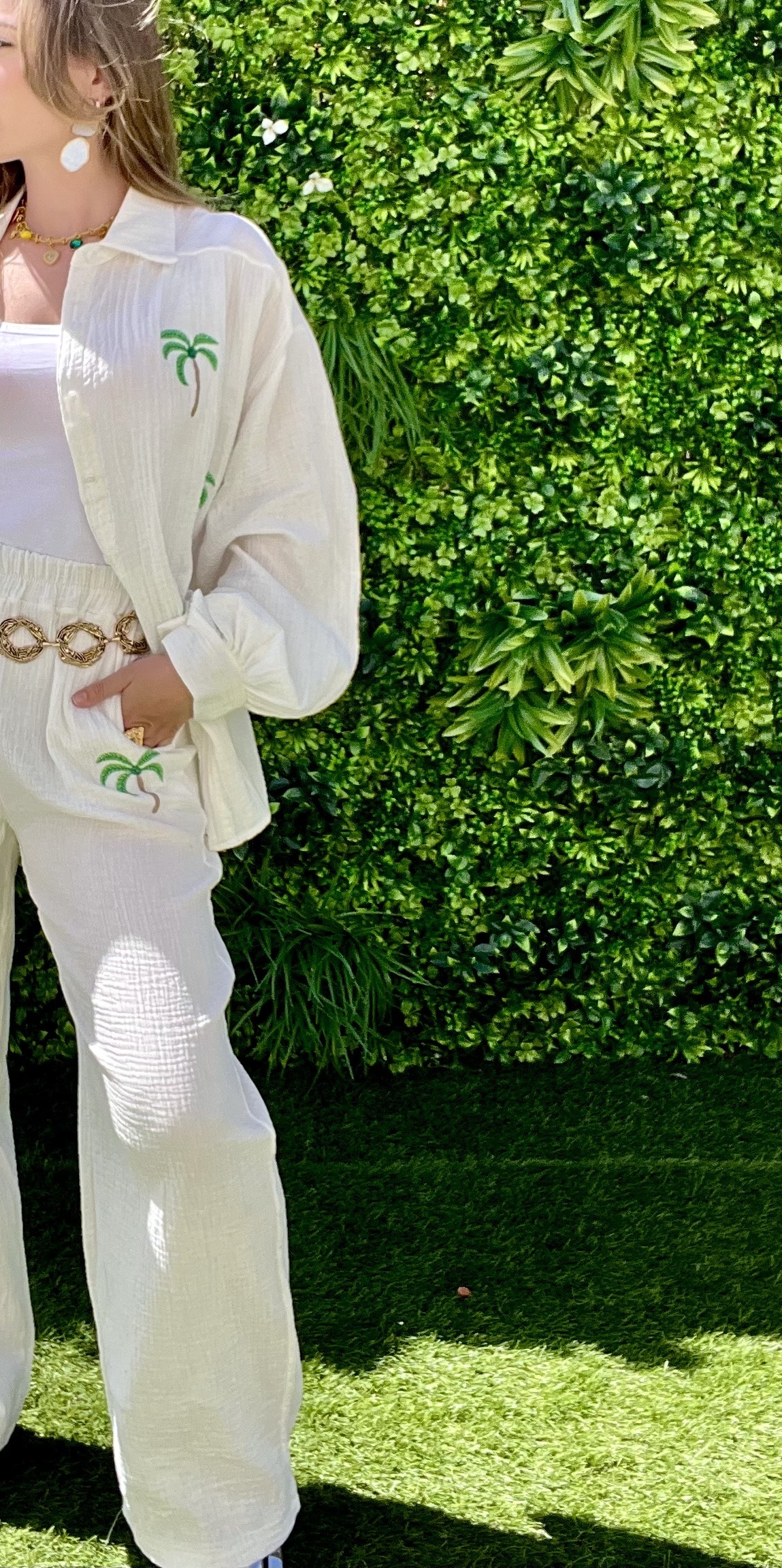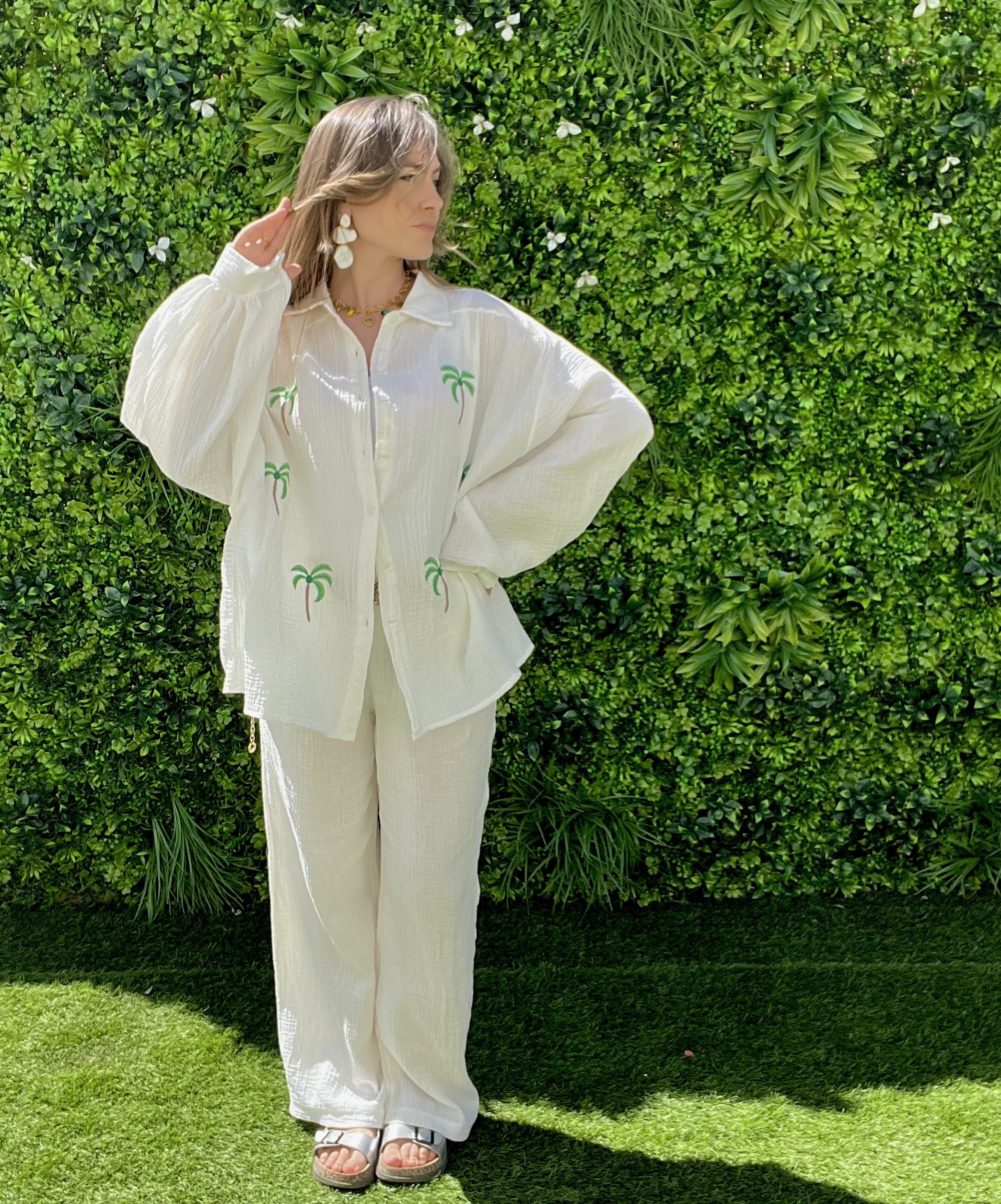 Ensemble en gaze de coton blanc. Il se compose d’un pantalon Palazzo à taille élastique, orné d’un palmier brodé sur le coté d’une poche, et d’une chemise oversize manches longues, avec palmiers placés de chaque coté.